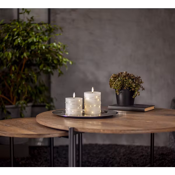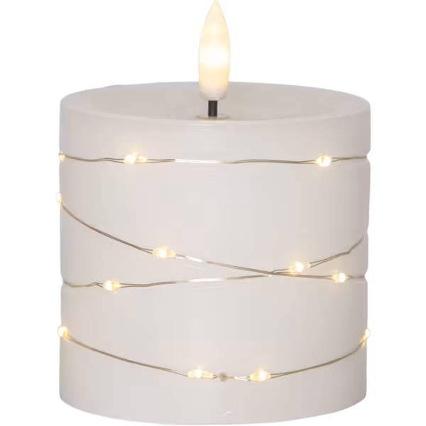 Flamme Dew är ett batteriljus av vitt stearin med lindad dew drop slinga runt om. Drivs av 2 AA batterier och har inbyggd timer, batterier ingår ej. Undvik att ställa ljuset i direkt solljus då det kan smälta och missfärgas av värmen. Storlek 8x10 cm inkl. lågan.