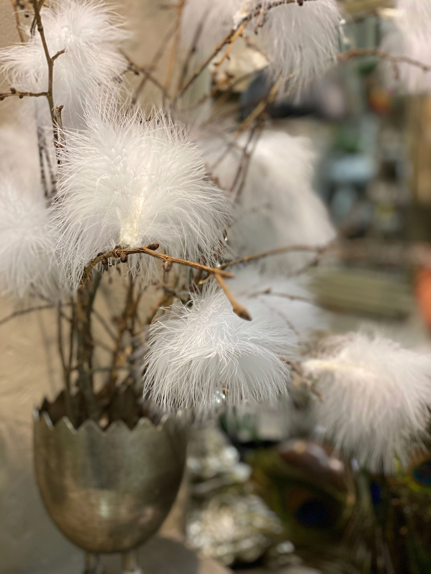 Fluffiga fjädrar med ståltråd som är perfekta för att dekorera grenar eller blomsterarrangemang.